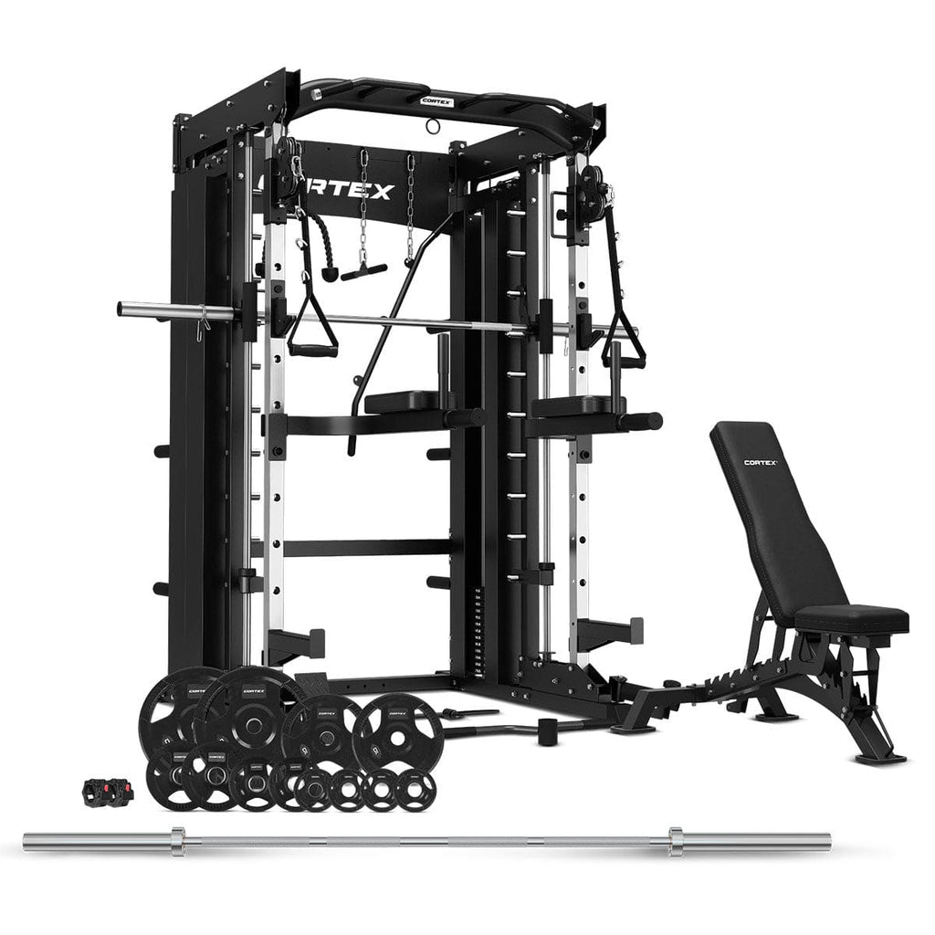 Introducing the complete fitness package designed to elevate your home gym experience. This comprehensive set includes everything you need for a truly next-level workout. The centrepiece is the Cortex SM-26 6-in-1 Power Rack with Dual Stack Smith & Cable Machine, offering versatility and functionality for a wide range of exercises. Accompanying this is the BN-9 adjustable exercise bench, providing stability and support for various strength training routines. To maximise your lifting potential, we've included the Spartan 205 Olympic Barbell with hard chrome finish, paired with Olympic lock jaw collars for secure plate attachment. Plus, the package features a selection of Cortex Tri-Grip Olympic Plates along with the Black Series V2 Bumper Plates. Elevate your strength training with this Cortex power pack: the ultimate solution for achieving your fitness goals from the comfort of your own home.