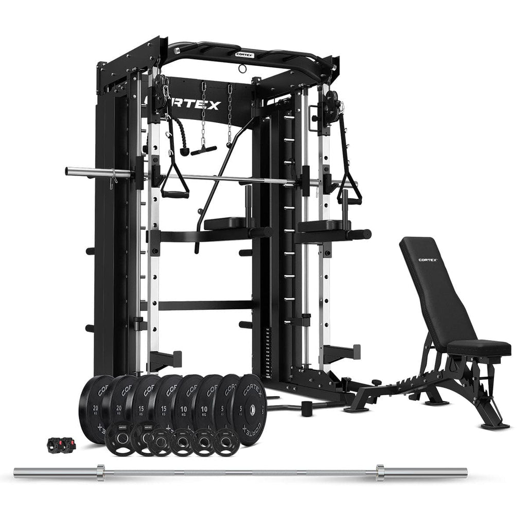 Introducing the complete fitness package designed to elevate your home gym experience. This comprehensive set includes everything you need for a truly next-level workout. The centrepiece is the Cortex SM-26 6-in-1 Power Rack with Dual Stack Smith & Cable Machine, offering versatility and functionality for a wide range of exercises. Accompanying this is the BN-9 adjustable exercise bench, providing stability and support for various strength training routines. To maximise your lifting potential, we've included the Spartan 205 Olympic Barbell with hard chrome finish, paired with Olympic lock jaw collars for secure plate attachment. Plus, the package features a selection of Cortex Tri-Grip Olympic Plates along with the Black Series V2 Bumper Plates. Elevate your strength training with this Cortex power pack: the ultimate solution for achieving your fitness goals from the comfort of your own home.