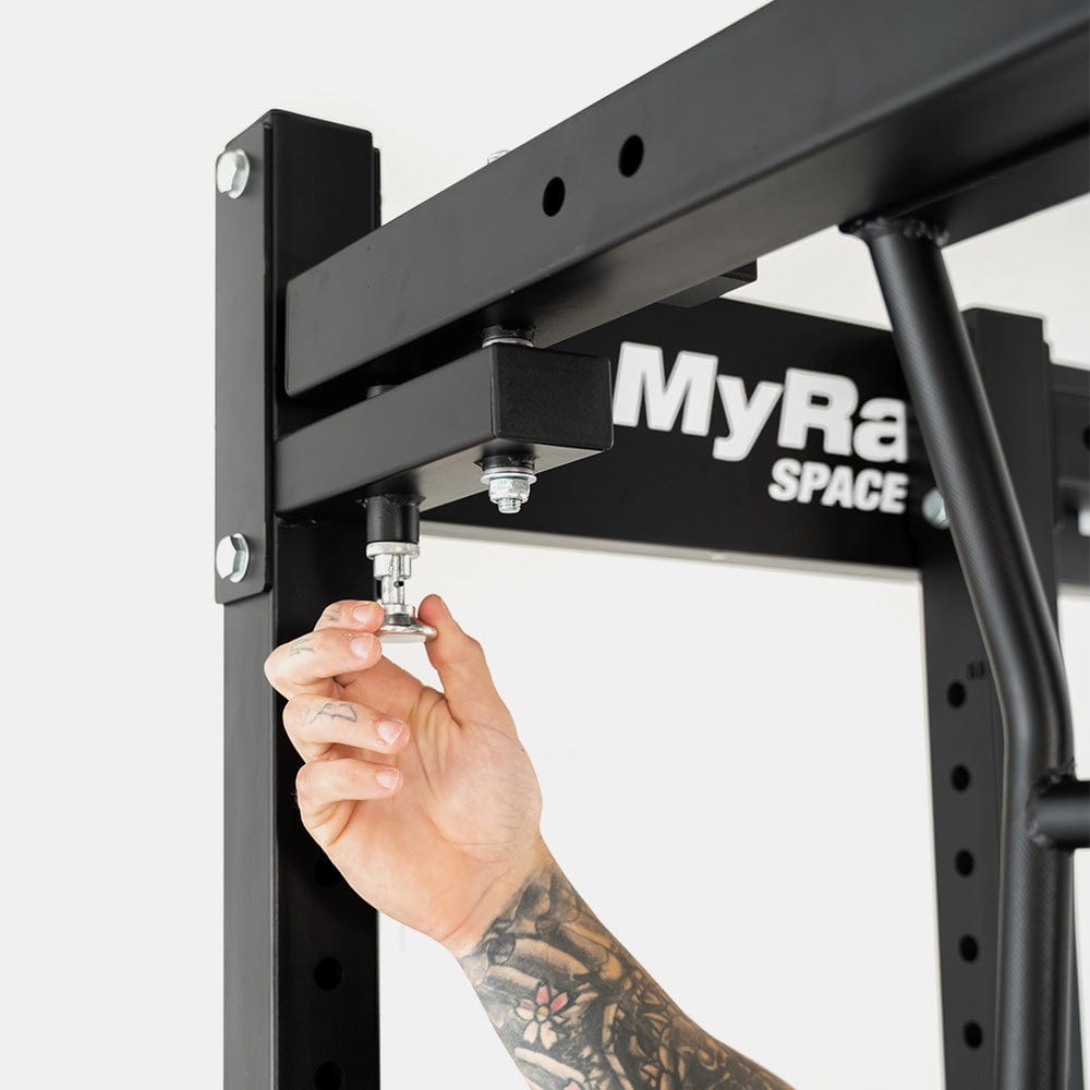 The MyRack SpaceSaver features westside spacing with 54 different numbered adjustment points, allowing any user to be able to perform a wide range of shoulder, arms, chest, back, core and leg exercises comfortably. The lower bench level heights have 1-inch spacing while the squat height levels have 2-inch spacing.