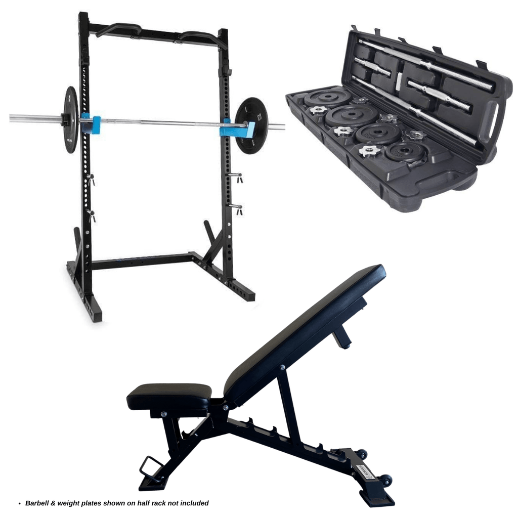 Level up your strength training with the all new Renegade Half Rack Package! The Renegade Half Rack Package contains everything you need to build strength and fitness all from the one compact package and includes: